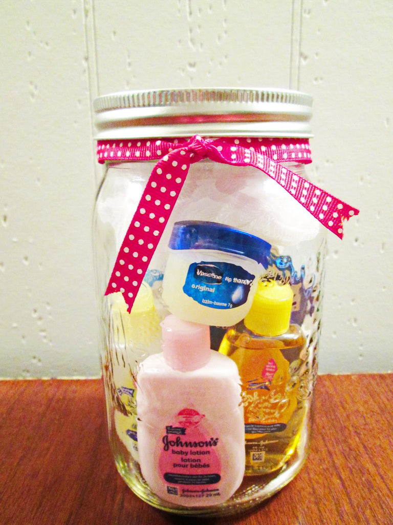 - Large Mason jar filled with baby travel sized goodies (body wash, shampoo, lotion, baby powder, penaten, and nursing pads)
